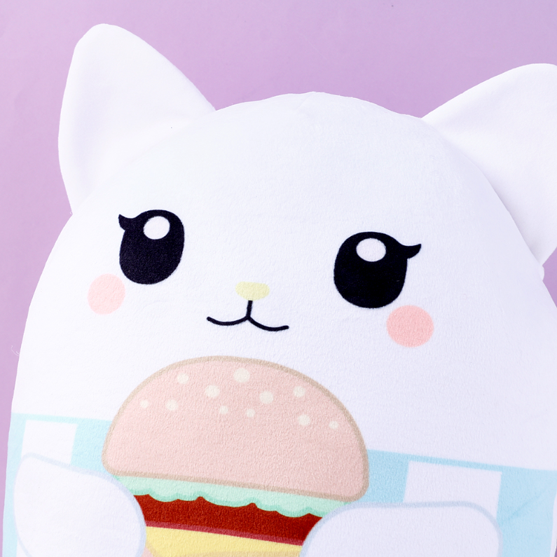 An adorable kitten-shaped throw pillow holding a cute hamburger, designed with soft fabric and cheerful colors. Comfortable and plush, it keeps its shape while adding a fun and cozy vibe to any space.